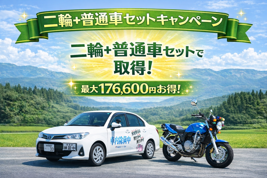 六日町自動車学校では、二輪免許+普通車免許をまとめて取得できる
